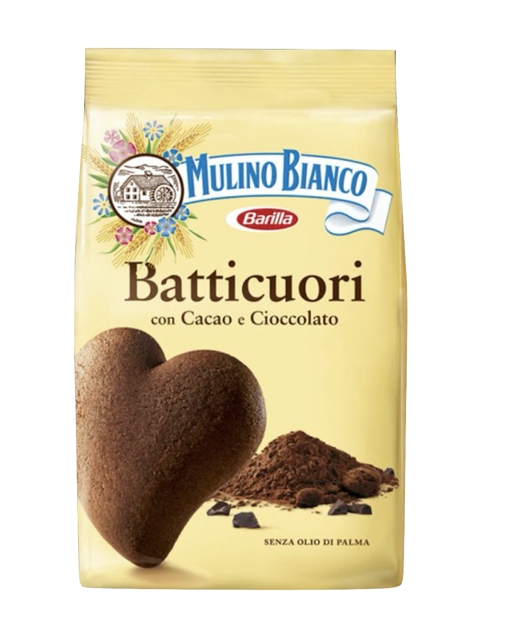 Ciastka kruche kakaowo - czekoladowe BATTICUORI od Mulino Bianco to idealne połączenie kakao, mleka i gorzkiej czekolady. Chrupiące i aromatyczne serca są doskonałym dodatkiem do porannej kawy lub filiżanki herbaty.