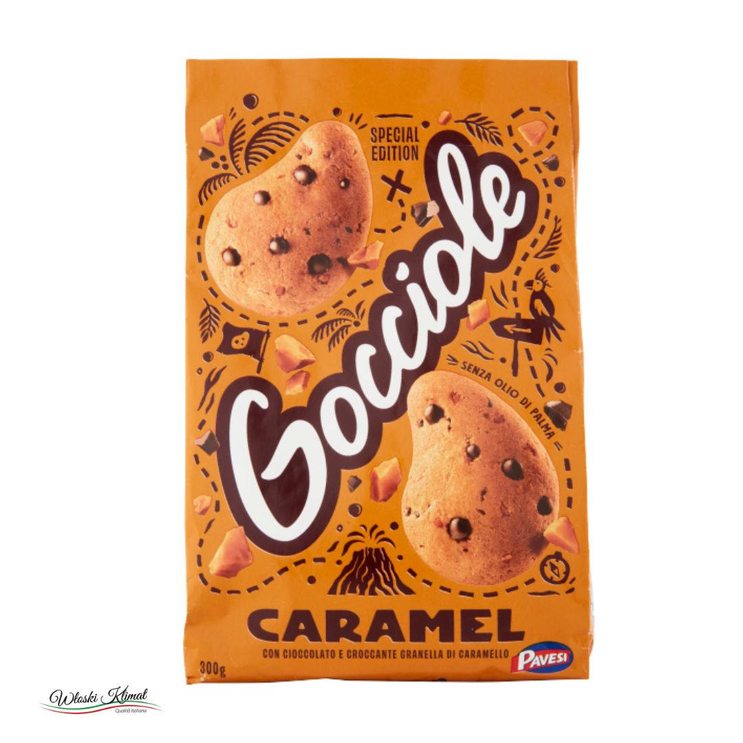 Ciastka kruche z kawałkami ciemnej czekolady i karmelem Gocciole Caramel PAVESI 300g