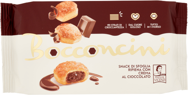 Matilde Vicenzi Millefoglie d'Italia Bocconcini Crema ald Cioccolato to wyborne włoskie ciasteczka z kruchego ciasta francuskiego z kremem czekoladowym. Zniewalający krem czekoladowy został otoczony 192 warstwami lekkiego i kruchego ciasta, To idealny wybór, gdy chcesz się cieszyć wyjątkową słodyczą prosto z Włoch. Doskonale smakują z kawą ,lub herbatą.