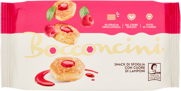 Bocconcini Lampone to pyszne, chrupiące ciasteczka, które składają się ze 192 bardzo cienkich warstw ciasta. Ich wnętrze wypełnione przepyszne, rozpływające się w ustach nadzienie malinowe. Doskonałe do kawy, herbaty oraz jako słodka przekąska o każdej porze dnia.