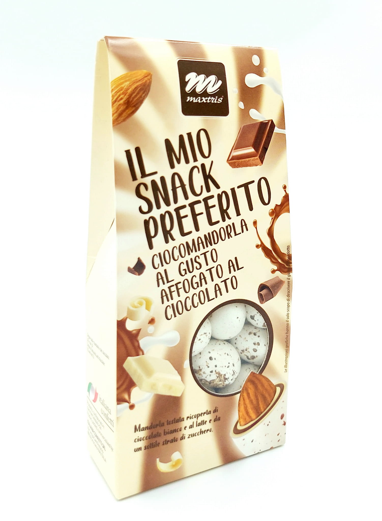 Maxtris IL Mio Snack Ciocomandorla al Ciociolato to połączenie klasycznego migdała, białej i mlecznej czekolady oraz centkowanej, lukrowej skorupki.