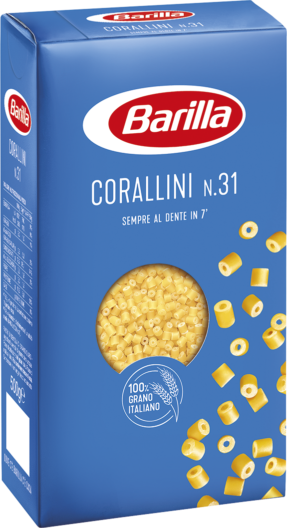 Corallini Barilla to rewelacyjnej jakości makaron z pszenicy durum, znany i doceniany na całym świecie. Corallini przypomina kształtem małe rurki, Doskonale nadaje się do makaronowych sałatek, do zup, dań na bazie sosów warzywnych i mięsnych. Uwielbiany przez dzieci.