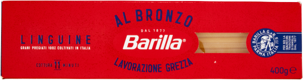 Specjalna linia makaronów Al Bronzo wytwarzana jest w procesie surowej obróbki, w której ciasto wytłaczane jest przez matryce z brązu poprzez wkładki wzbogacone mikrograwerami. To one nadają makaronowi intensywną chropowatość i sprawiają, iż sosy lepiej utrzymują się na powierzchni makaronu. Dzięki wysokiej szorstkości oraz specjalnej metodzie Raw Processing, doskonale komponują się z różnymi sosami. Bursztynowo-żółty kolor i chropowata powierzchnia sprawia, że Barilla Al Bronzo Linguine jest naprawdę wyjątkowe.