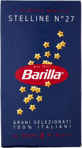 Makaron Stelline gwiazdki nr 27 Barilla to rewelacyjnej jakości makaron z pszenicy durum, znany i doceniany na całym świecie. Po ugotowaniu pozostaje zawsze "al dente". Doskonale nadaje się do makaronowych dań, sałatek, do zup i zapiekanek makaronowych. Uwielbiany przez dzieci.