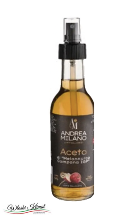 Aceto di "Melannurca" Campana IGP od ANDREA MILANO to wysokiej jakości ocet jabłkowy, wyrabiany z wyjątkowych jabłek Melannurca, pochodzących z regionu Kampania we Włoszech. Jest idealny do sałatek, marynat, sosów oraz jako dodatek do wielu dań kuchni śródziemnomorskiej.